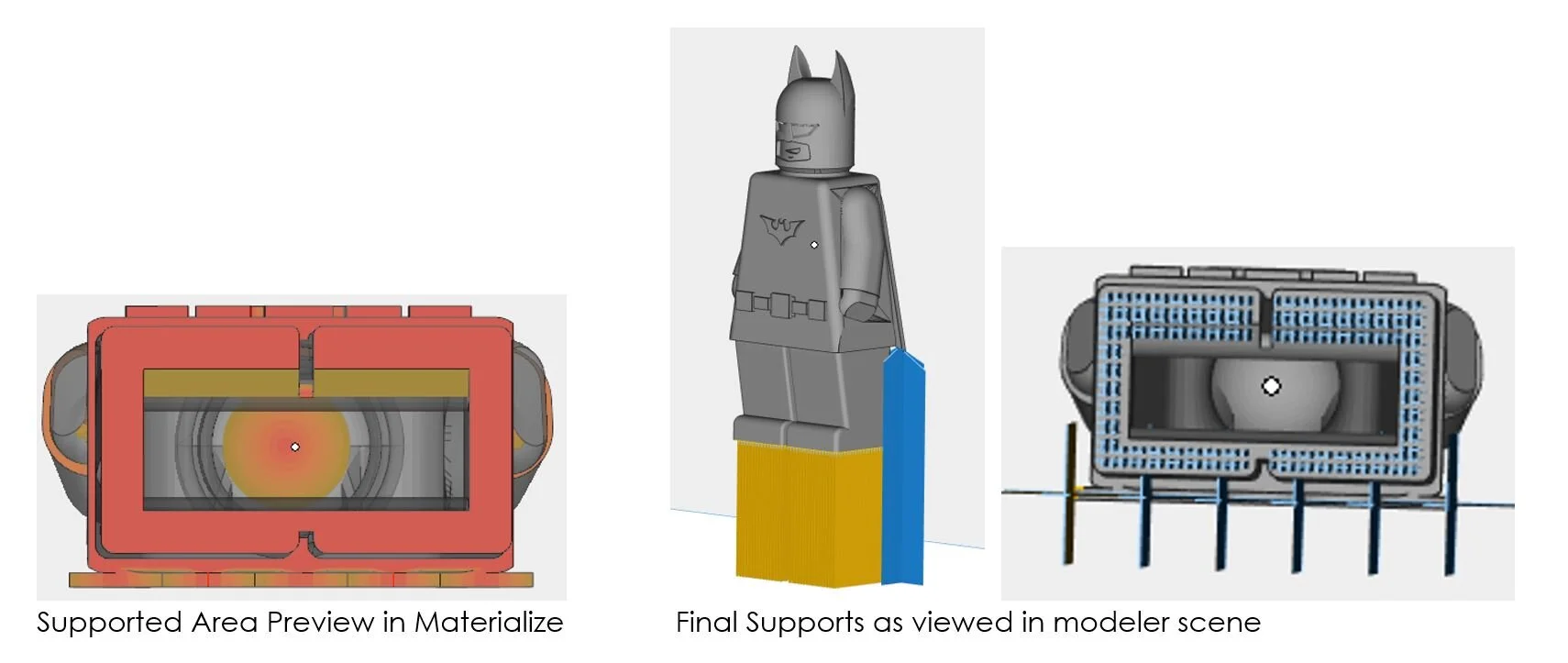 Materialize print setup: Using Materialize software, block supports were placed underneath the feet to separate the part from the build plate; this minimizes residual stress by reducing the cross sectional area while anchoring the part to the plate.