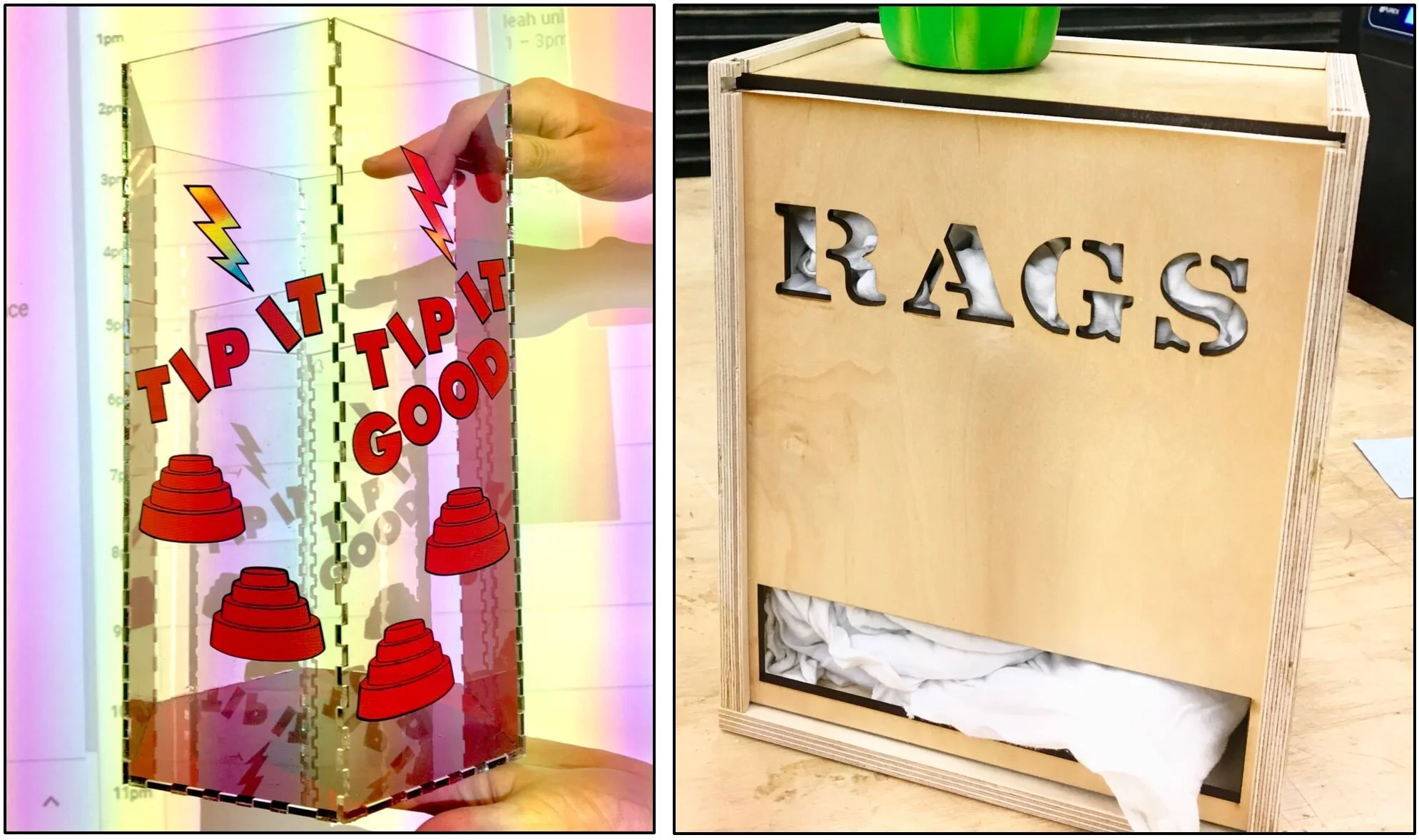 Tip box commissioned for “The Groove Objective” blues band (Laser cut in acrylic; labels designed in Adobe Illustrator and vinyl sliced).