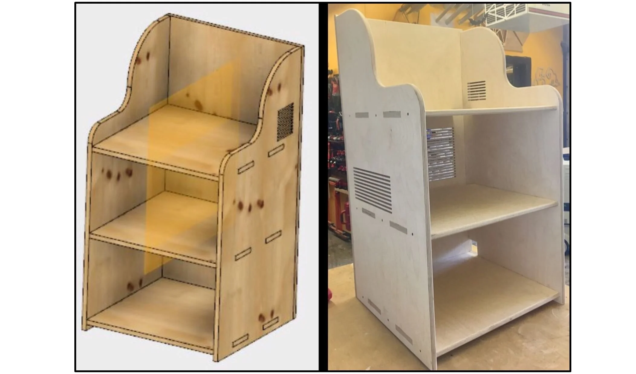 The panels were laid flat for milling, CAM and feeds and speeds calculated, dogbones added in internal corner for slot fitting, then finished and assembled.